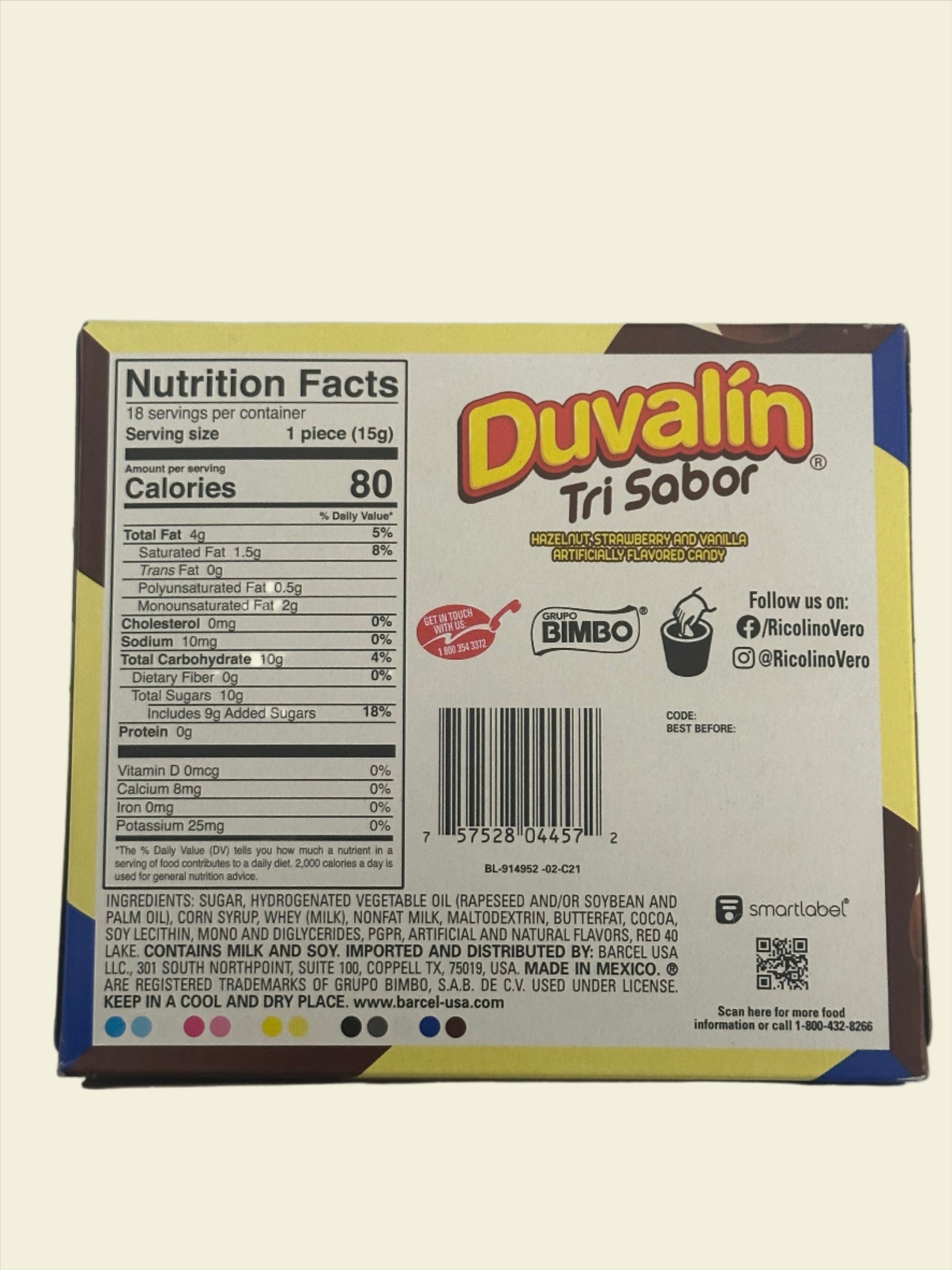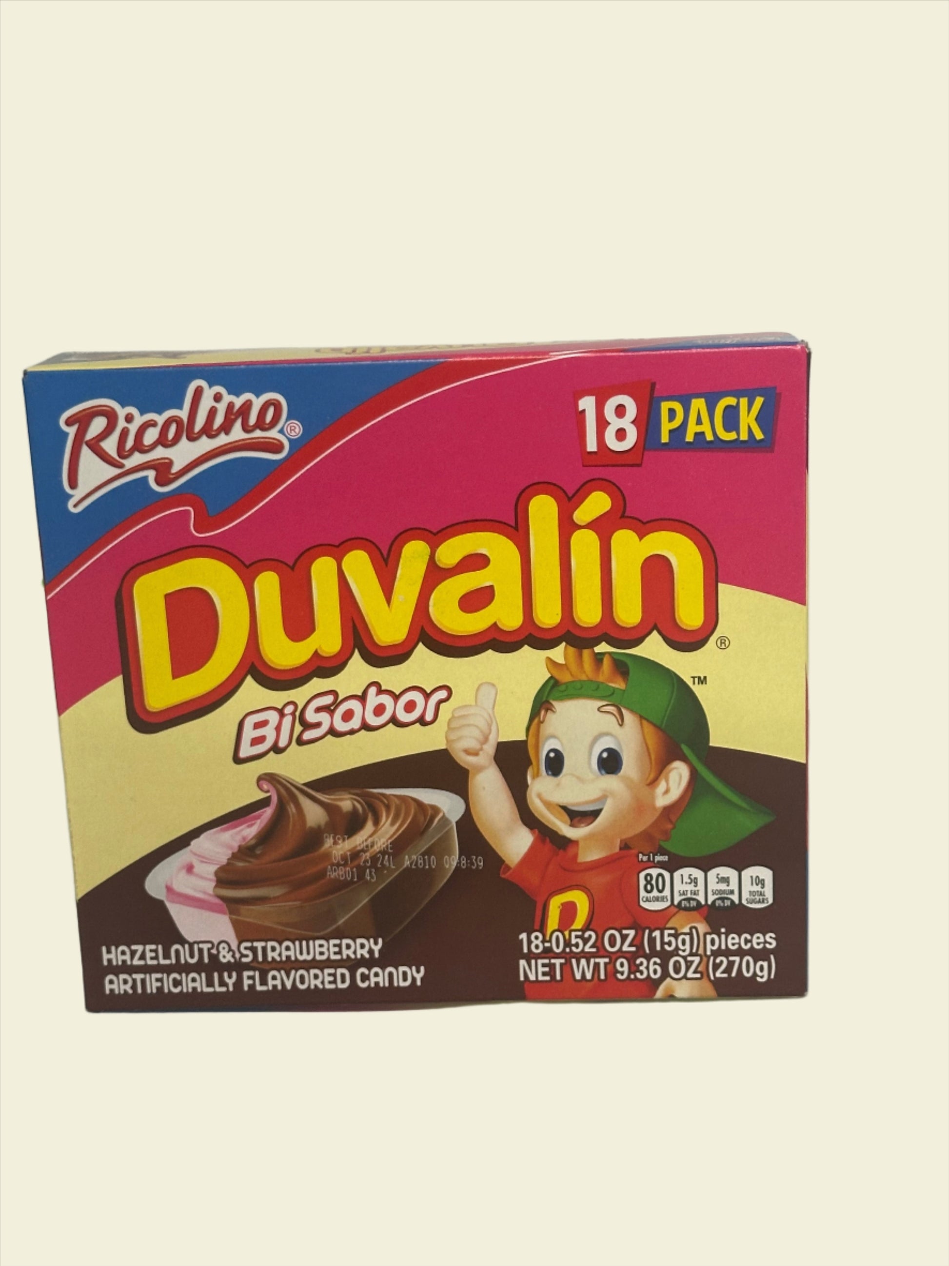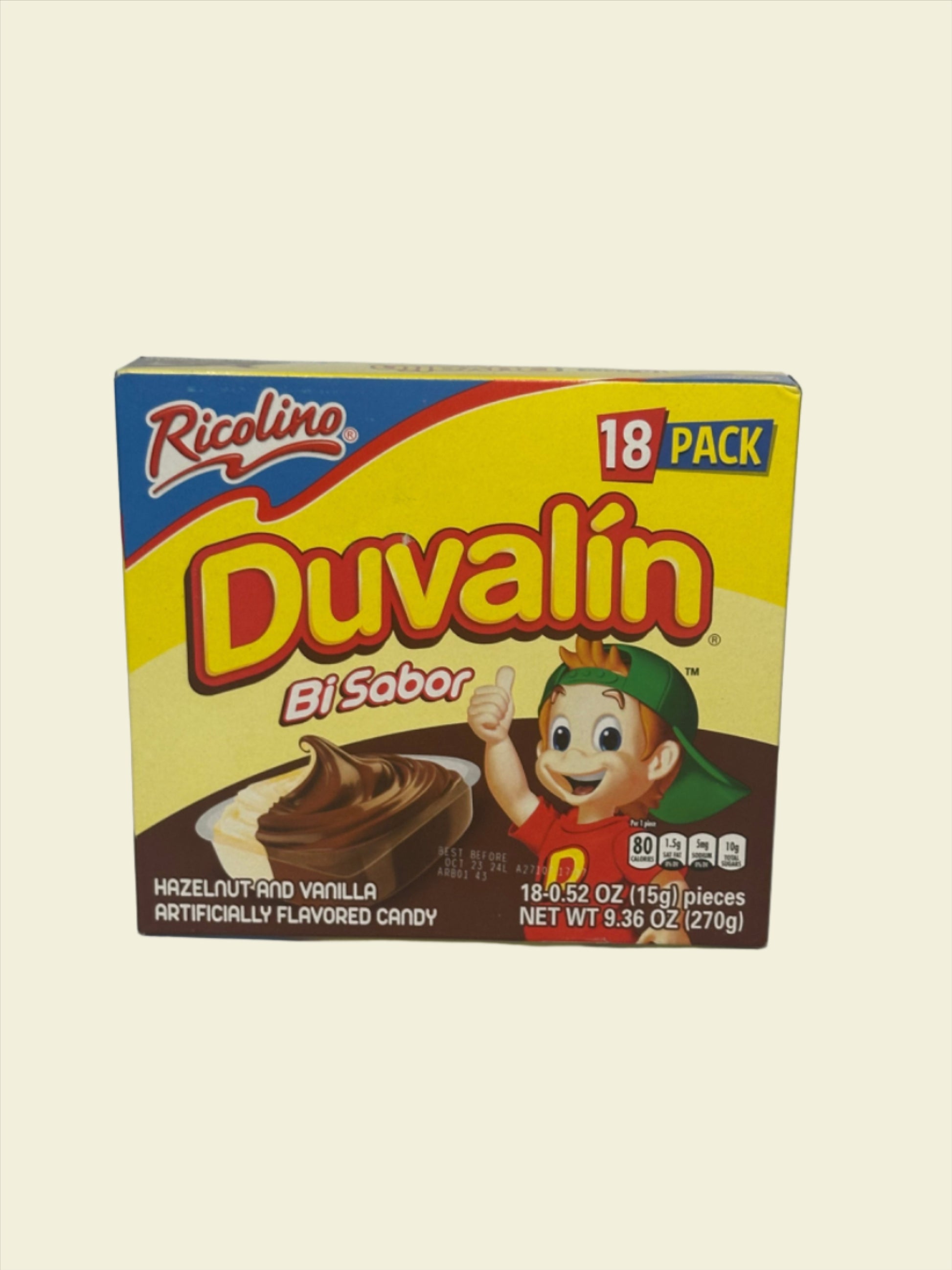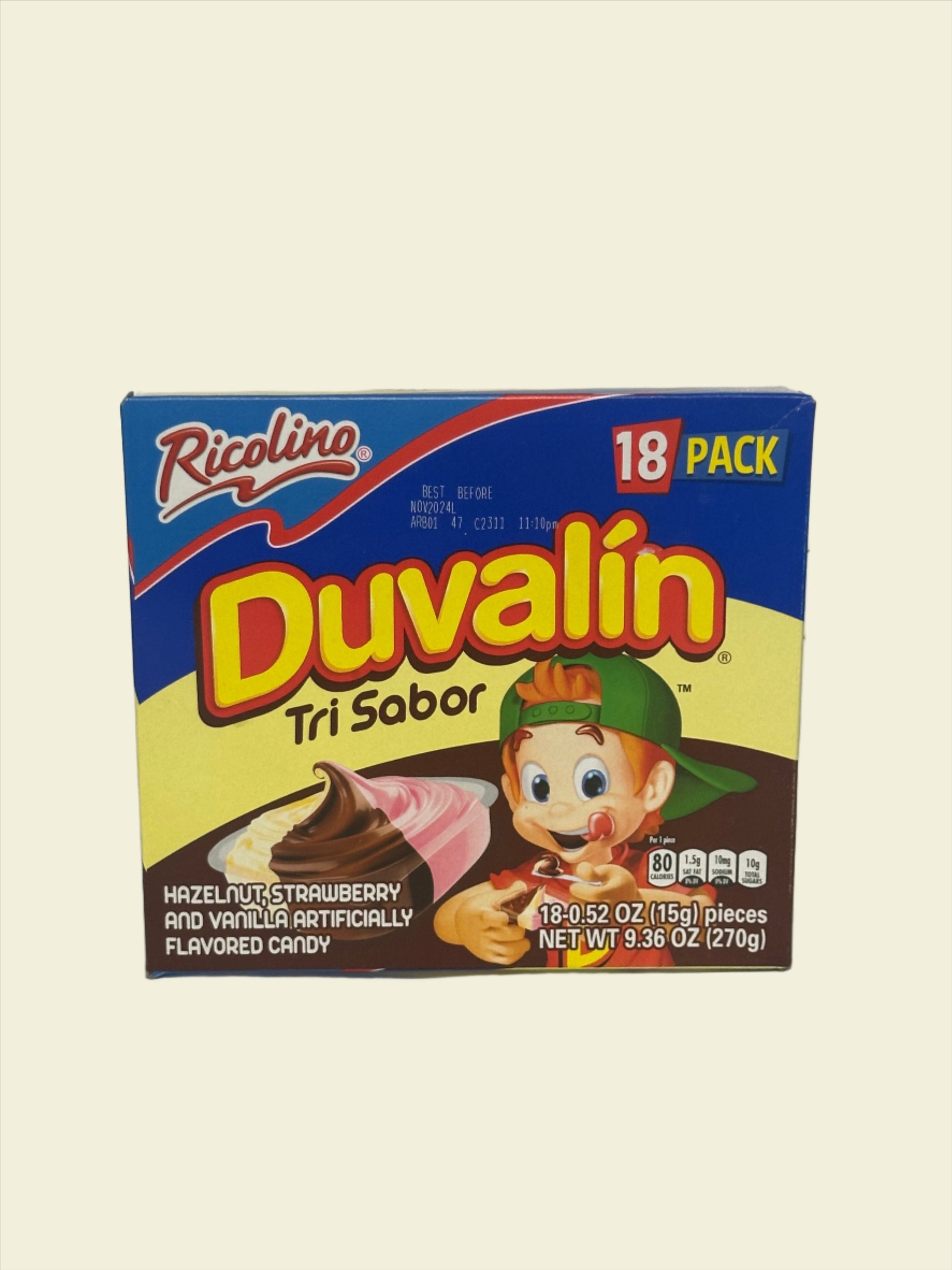 Duvalin candies are Mexican treats renowned for their creamy texture and delectable flavor combinations. Each bite-sized piece offers a delightful fusion of flavors, ranging from classic pairings like chocolate and vanilla to more unique combinations like hazelnut and strawberry. Whether you're craving something rich and indulgent or fruity and refreshing, Duvalin candies have something to satisfy every palate. Loved by both children and adults, these irresistible treats are perfect for snacking on the go or enjoying as a special indulgence. With their playful packaging and mouthwatering taste, Duvalin candies are sure to brighten up any snack time or celebration.