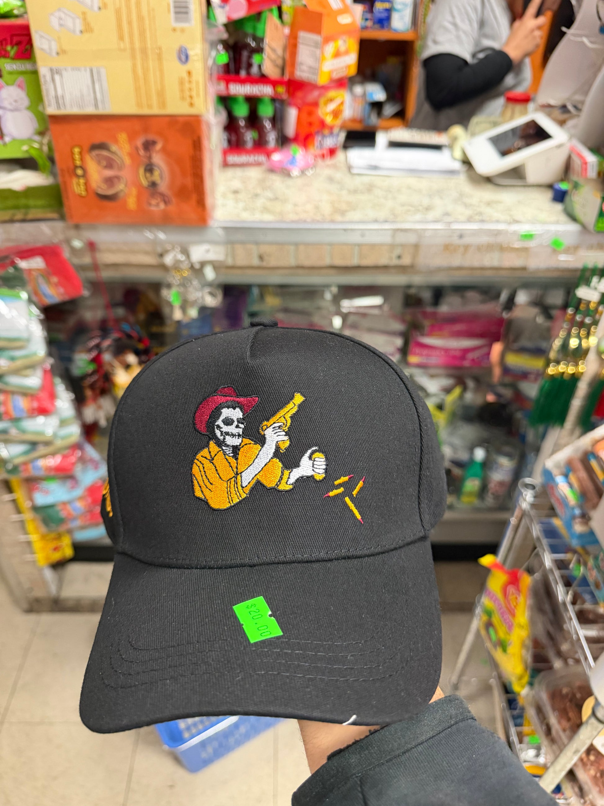 Gorra color beige con visera negra bordada con diseño exclusivo “Rey del Corrido” y gráfico de vaquero calavera estilo corridos. Un estilo que mezcla cultura regional mexicana con streetwear moderno.